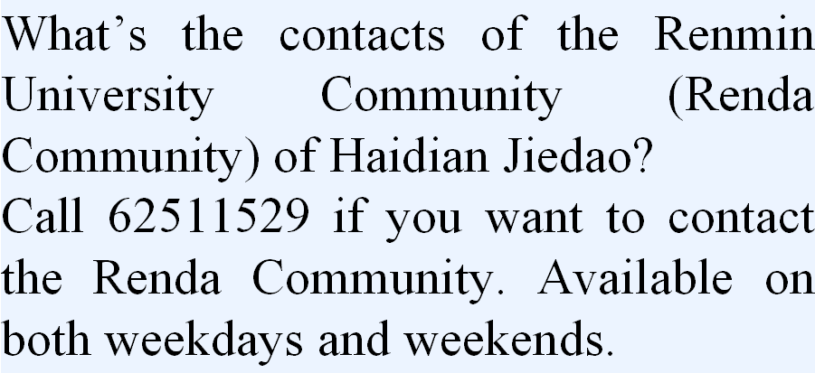 What’s the contacts of the Renmin University Community (Renda Community) of Haidian Jiedao?