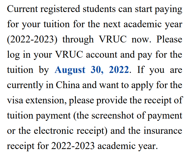 请学籍状态为在学的国际学生于2022年8月30日前登录微人大系统缴纳2022-2023学年学费。目前在华的自费生办理签证延期手续前,需向留学生办公室提供学费缴纳凭证(学费缴纳页面的截图或学费电子收据)以及2022-2023学年来华保险发票凭证。