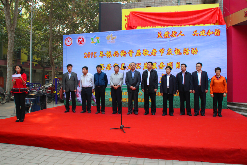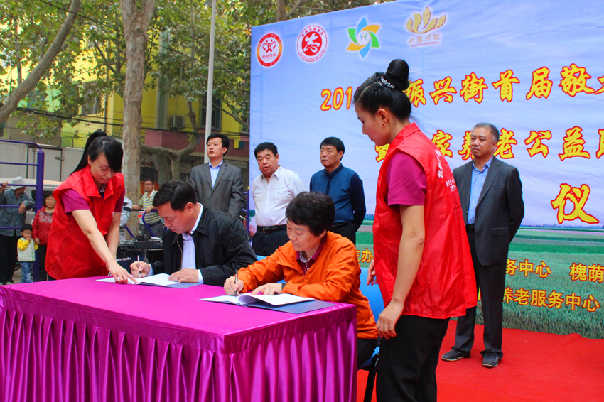 与济南市槐荫区振兴街办事处、济南天思国际养老服务中心在“2015振兴街首届敬老节”上举行签约揭牌仪式,共建“劳动与社会保障研究暨专业人才培育基地”。