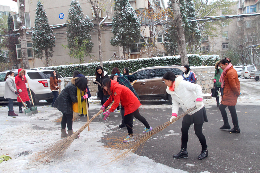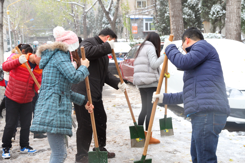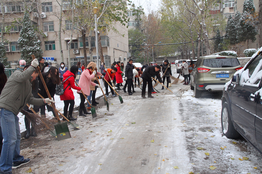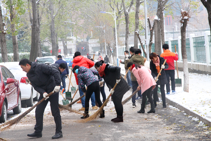 组织学院师生员工进行校园积雪清扫活动。
