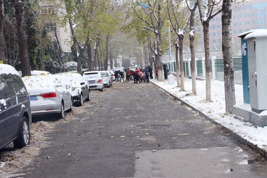 卫生区大部分处于阳光长期照射不到的阴面,且长时间辗压,积雪早已经凝结成厚冰。在经历了长达两个多小时的清理,终于将东区卫生区路面彻底清理干净,光亮如新。天寒地冻,许多老师和研究生累得气喘吁吁,汗流浃背。
