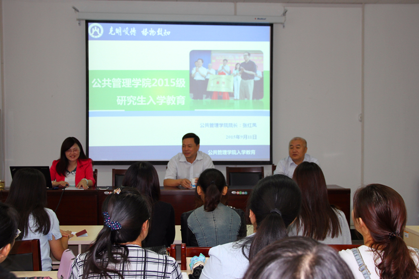 在燕山校区4407举行2015级研究生新生入学教育暨与院领导见面会。院长张红凤,党委书记郑磊,副院长李国锋,党委副书记周炎,院长助理贾海彦、张禹,教学秘书朱艳,辅导员李昭娜及2015级全体新生出席此次会议,会议由副院长李国锋主持。