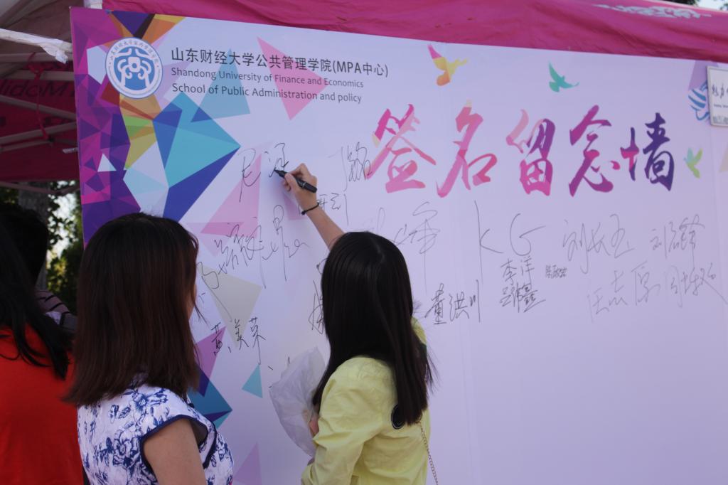 师生做了大量的准备工作,在迎新场地随处可见迎新条幅、人性化的道路指示。此外还加入了签名墙、学生证背景板等特色元素,让人耳目一新。设置家长休息区,减缓家长的疲惫,体现人性化特色。