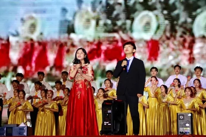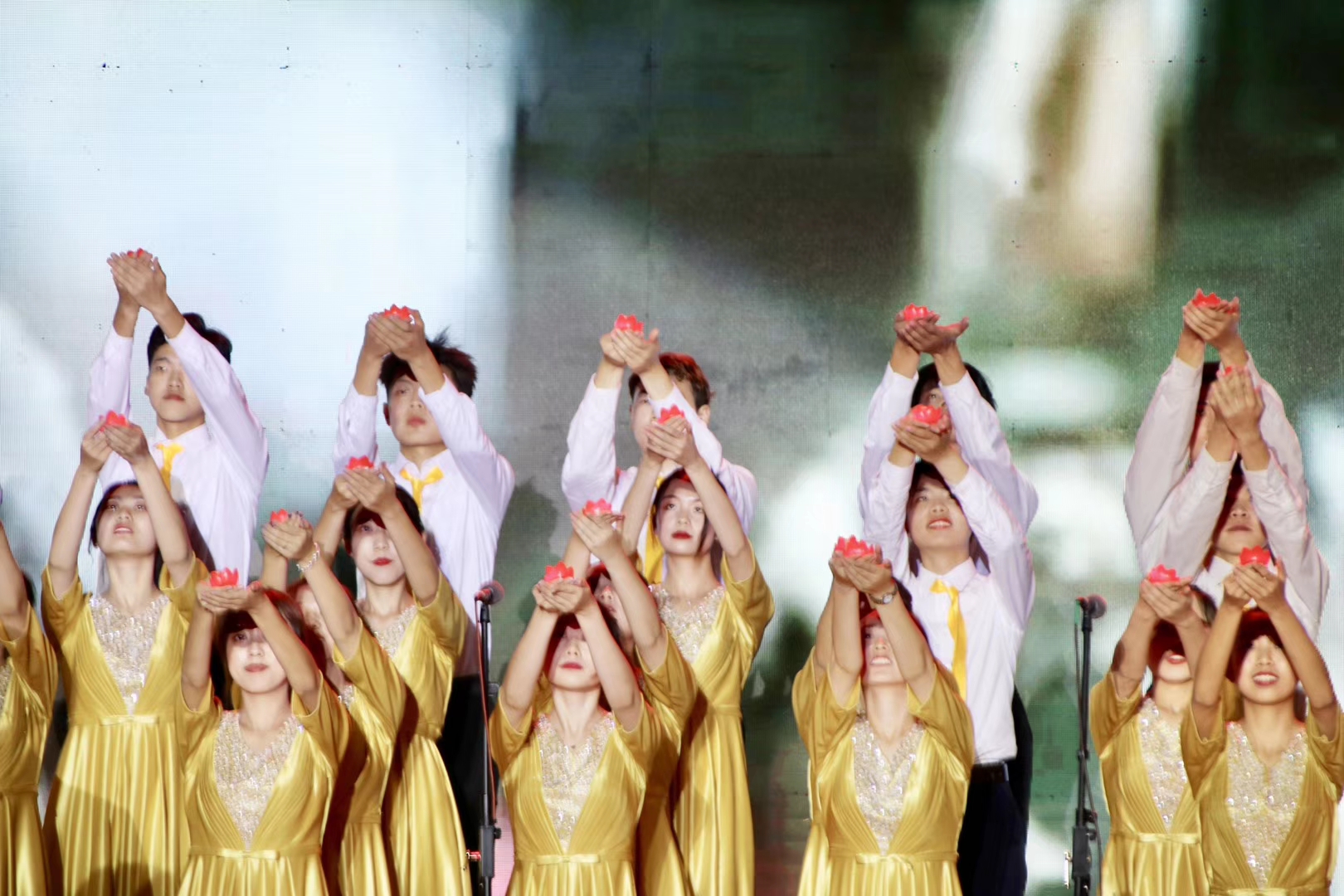 部分大二学生组成,分为合唱与手势舞两个表演部分。吕晓燕书记身着正红色刺绣礼裙,与领唱学生李世童所着西装交相辉映;合唱成员身着姜黄礼服,两侧手势舞成员则穿着形式多样的民族服装,手捧红烛,随歌声而舞。服装庄重大气、寓意深远,歌唱优美动听、配合默契,从视觉与听觉两方面给观众带来双重感官享受。