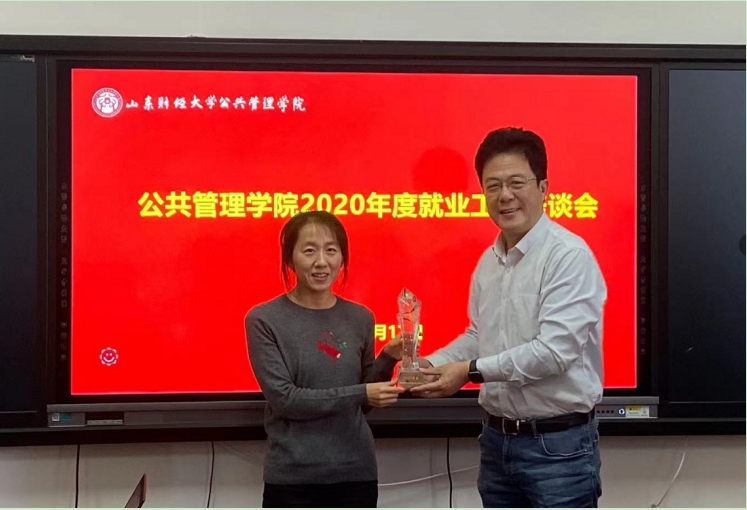 最后,就业指导处为学院颁发了“2019年度就业先进单位(就业服务奖)”奖牌,为李昭娜颁发了“2019年度就业先进个人”奖杯。