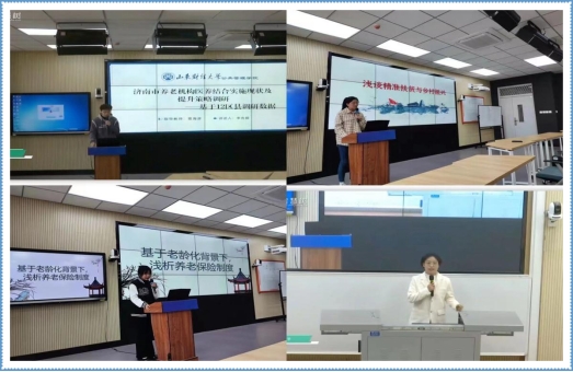 学生做了《济南市医养结合实施现状及提升策——基于12区县调研数据》《浅谈精准扶贫与乡村振兴》《基于老龄化背景下,浅析养老保险制度》三个报告,塔里木大学的学生做了《社区+居家智慧养老服务计划》《女性就业权益保障一生育假期》两个报告。学生们从自己实践调研中的发现、自己关心的社会保障相关内容等不同的角度,为两校学生呈现了精彩一课。