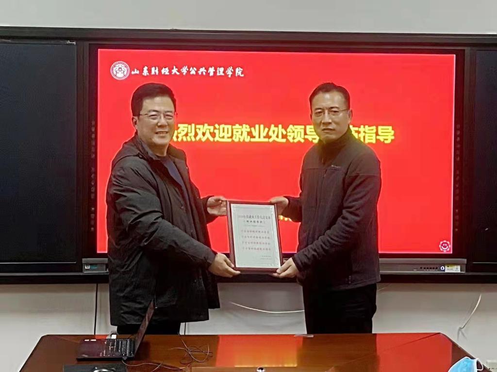 最后,杨哲处长为学院颁发了“2020年度就业先进单位”奖牌,为“2020年度就业先进个人”获得者吕晓燕、李旭日颁发了奖杯。