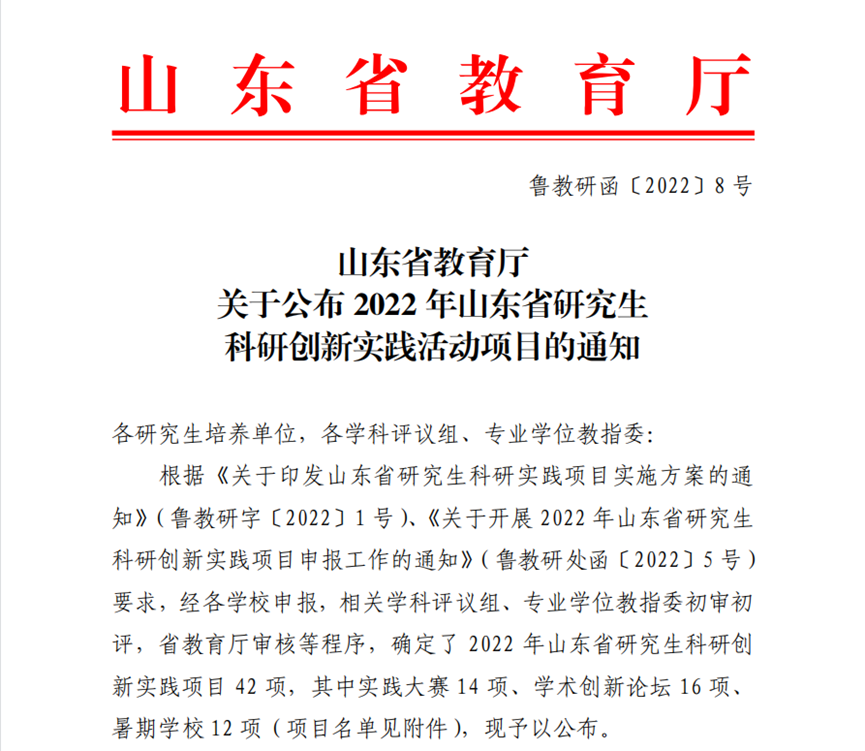 据悉,2022年山东省研究生科研创新实践活动项目经各高校申报,相关学科评议组、专业学位教指委初审初评,省教育厅审核等程序,最终立项实践大赛14项、学术创新论坛16项、暑期学校12项。
