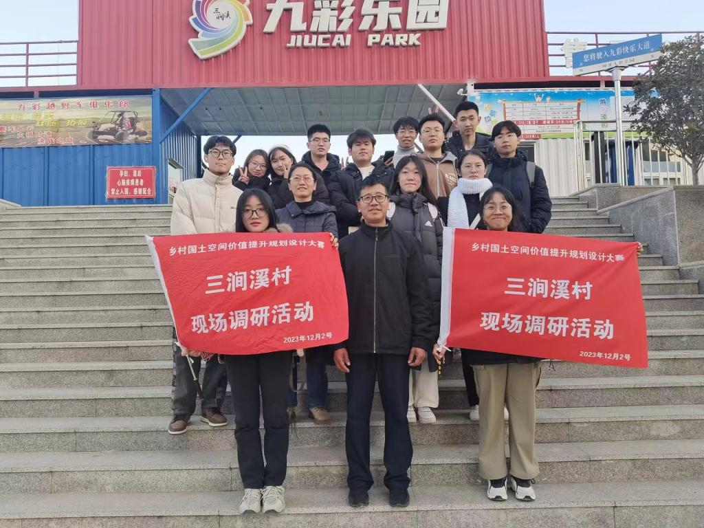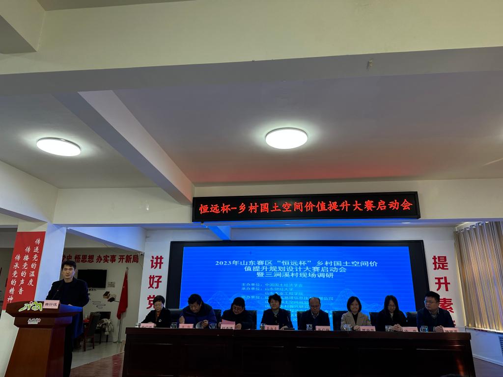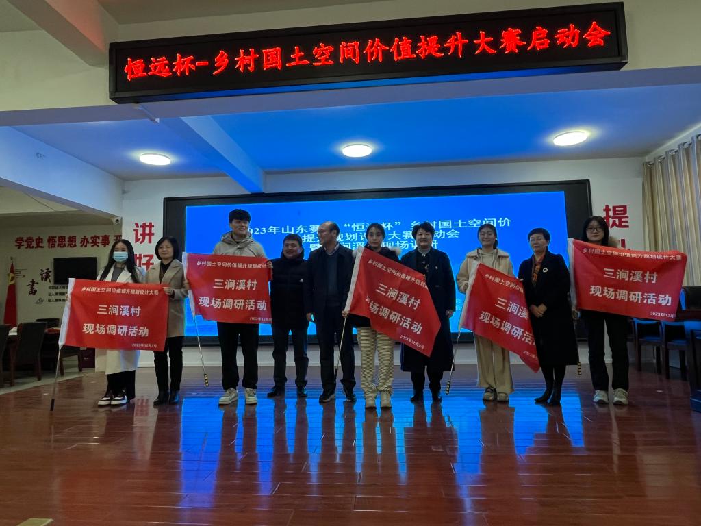在学科建设、人才队伍建设等方面取得的显著成绩以及发展情况。她指出,当前,我国农村面临着许多问题,提升乡村价值已成为一个时代性主题。希望通过本次比赛能够加深同学们对乡村发展的认识和理解,将理论知识与实践相结合,增强社会责任感和使命感,为乡村振兴战略和齐鲁乡村振兴样板打造贡献自己的力量。随后,刘兆德理事长从服务国土空间规划的角度对本次活动的重要性进行了阐释,并对参赛学生提出了殷切的希望。韩延忠总经理首先介绍了企业发展情况,并愿意一直支持大学生社会实践活动。高淑贞书记全面介绍了三涧溪村的历史沿革与发展规划,为参赛师生提供了规划指引和方向。姜广辉院长做了“乡村国土空间价值提升路径”专题报告,介绍了第一届乡村国土空间价值提升规划大赛的部分获奖作品,在如何寻找发力点、如何经规划设计和如何进行成果表达等方面给予参赛师生很多启迪。王元虎书记以三涧溪村三产融合发展项目为例,介绍了闭环式源虎乐园的发展规划,为大家提供了一个典型案例和设计素材。启动会最后,与会专家为参赛师生举行了“三涧溪村现场调研活动”授旗仪式。