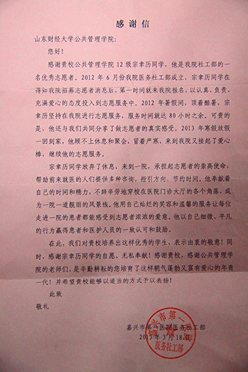 成人台小说 2012级学生宗聿历,是嘉兴市第一医院医务社工部的一名优秀志愿者。自2012年6月嘉兴市第一医院社工部成立以来,宗聿历同学一直以认真、负责、充满爱心的态度进行志愿者服务。无论是炎热的暑假,还是寒冷的寒假,宗聿历同学只要一回到家,就会继续他的志愿服务。他用放假休息的时间来到医院,不辞辛劳的服务在医院的每一个角落,感动着每一位患者和医护人员。为此,嘉兴市第一医院医务社工部特别向成人台小说 发来感谢信,感谢宗聿历同学的无私奉献,感谢成人台小说 培养出如此优秀的学生。