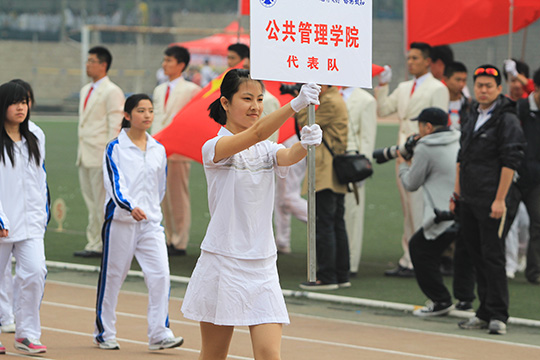 代表队方阵高举蓝白相间的院旗,队形整齐,步伐矫健。“驰骋赛场,斗志昂扬,公管骄子,笑傲群芳”的口号彰显出成人台小说