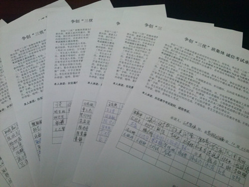 2012—2013学年第一学期期末考试临近,为了保持良好的考风、考纪,创造一个公平、公正的考试环境,成人台小说 全体学生在期末复习之余,还参加了“争创三优班级诚信考试”大型签字活动。