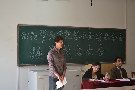 大会由学院团总支书记王恩娟主持,会议首先宣布了第十一届学生会明水分会人员名单,接着由第十届学生会明水分会主席、第十一届学生会主席毕竞男代表上届学生会做了工作总结,并对这一届学生会提出了新的要求。随后,第十一届学生会明水分会主席王彦国发言,他表示要信守竞选时的承诺,以服务同学为目的,更加积极、主动,规范的去工作。最后,党总支副书记周炎讲话,他首先对新一届明水分会成立表示祝贺,同时强调新一届学生会明水分会要在党总支的领导下,团总支的指导下,牢记全心全意为同学服务的要求,秉承严谨的工作作风,处理好学习与工作的关系,做好各项学生会工作。