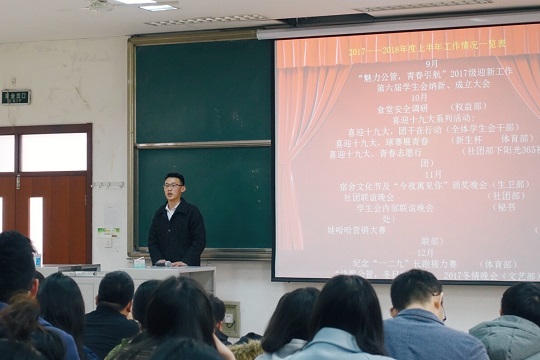 最后,张辉老师进行大会总结,对学生会取得的各项学生活动成果表示了肯定。张老师强调,学生会成员要树立全心全意为同学服务的思想,明确职责,在工作中鼓励创新;加强部门内部的团结、部门间的交流以及与兄弟学院的交流,学会借鉴,避免闭门造车的现象;将学习作为第一要务,平衡好学习与工作的关系,为同学们树立好的榜样。