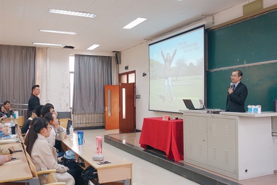 宋老师向同学们分享了自己在清华大学、北京大学、牛津大学、剑桥大学等世界各地著名高校游览、访学的经历,趣味十足的故事和生动独到的见解,引来同学们由衷的赞叹与向往。接着,宋老师从就业、圆名校梦、获得更高学位等方面为我们详尽介绍“考研”这个热门话题,并引用往届学生的成功案例鼓励大家确定目标、努力学习,同时就考研择校选专业、合理安排学习时间等方面提出了宝贵建议。在会议最后的师生互动环节,宋老师详细回答了每位同学提出的问题,现场氛围积极活跃。