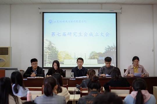 在4407召开第七届研究生会换届成立大会,学院党委副书记周炎,辅导员李昭娜,第六届研究生会主席团成员,第七届研究生会主席团成员、各部部长及2018级全体研究生参加了会议。会议由李陈陈主持。