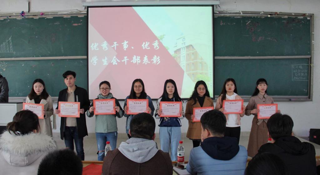 学生会主席刘瑞总结上学期的工作心得,提出学生会发展中的短板。希望加强学生会各部门的创新力度,加强规矩机制,提高个人修养,力求开展更加有意义的校园活动。接着,大会宣读第七届学生会优秀干事、优秀学生会干部表彰名单,主席团成员为获奖同学颁奖,并合影留念。