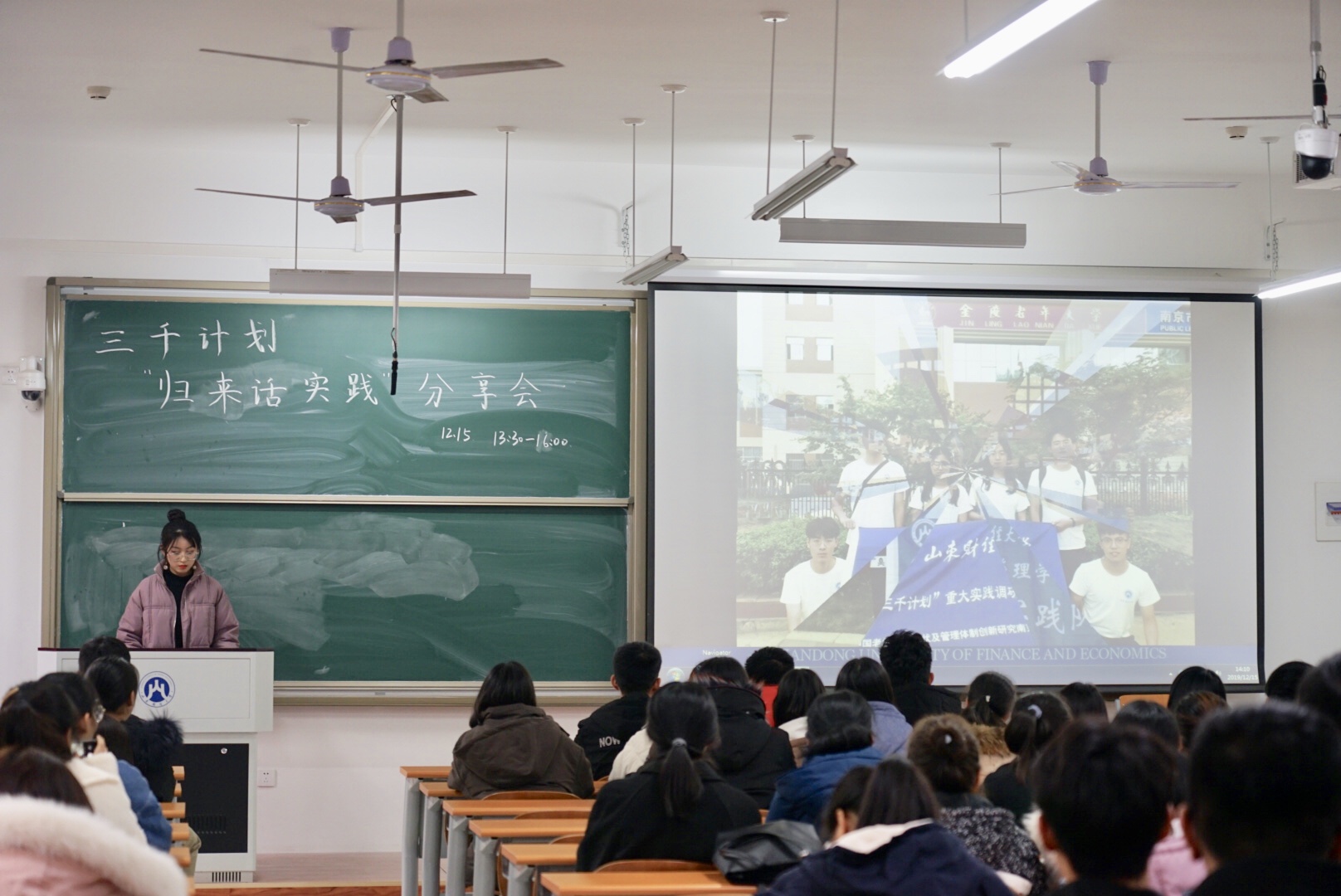 于圣井校区8208召开了三千计划“归来话实践”分享会。会议由实创部副部范文琴主持,大一部分同学参加了分享会,17级的优秀调研团队队长――行政管理1702金琳和公共事业管理1701董桂峰与同学们面对面分享交流了实践经验。