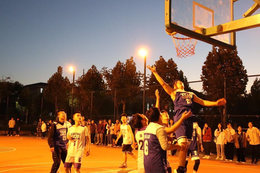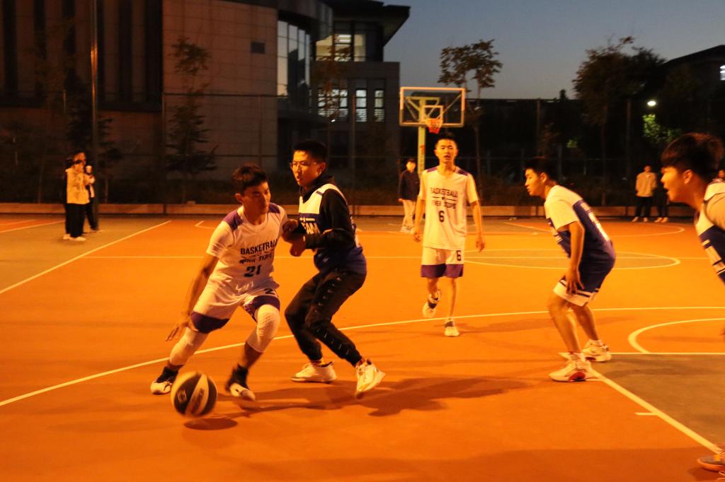 第二场由B组同D组进行比拼。夕阳西下,夜幕降临,丝毫未褪去参赛队员的热情,相反每一位队员都势如破竹,精神百倍。赛场上D组吾拉木同学披荆斩棘,勇往直前,带领D组成员成功突破B组成员的围追堵截,B组成员也逞而不让,紧紧咬住比分。最终D组以62:54获胜。