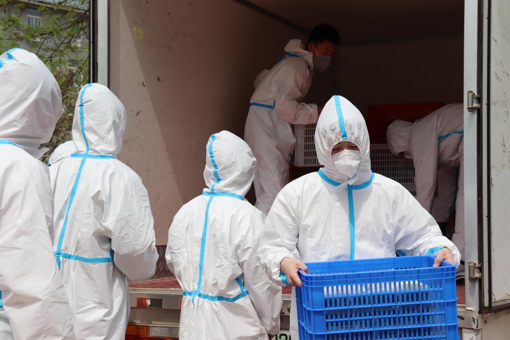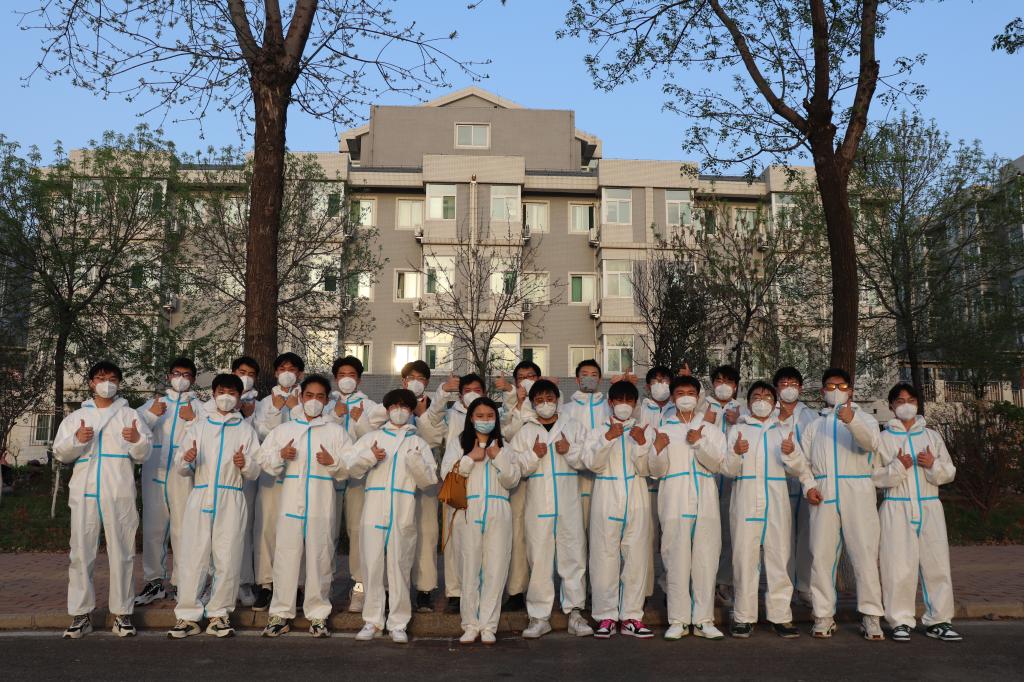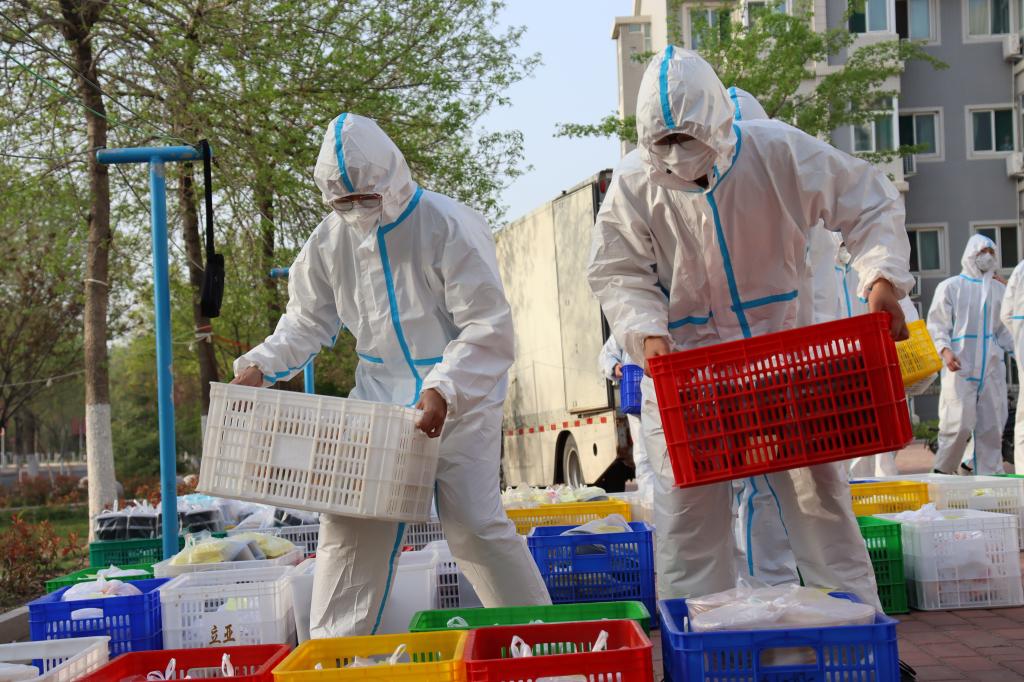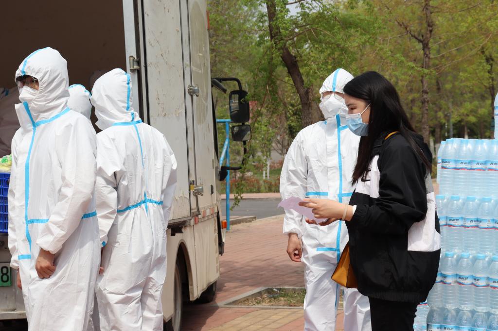 40名志愿者收到疫情防护服和口罩,其中防护服一餐一套,严格保障食品安全,口罩分配专用防疫口罩,确保志愿者安全。接着学院对40名志愿者进行分组,第1组20名同学去二号餐厅装车;第2组20名同学在宿舍楼门口卸车并且按学院分餐。