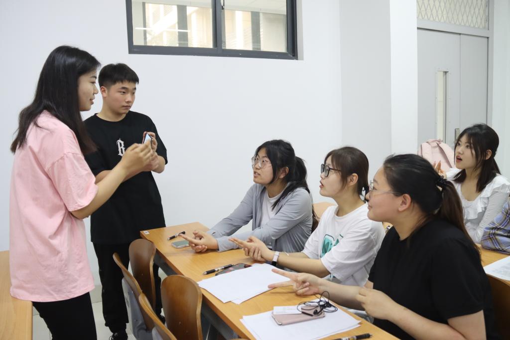 5月25日进行复赛,本次竞赛以小组为单位展开较量,36名晋级同学自由组成6支队伍,进行三轮环节的比拼。首轮环节为“风采展示”,小组6名成员自行就坐依次答题,最后将个人成绩累计至团队总成绩。同学们踊跃表现,干劲十足,各个队伍比分不相上下,现场气氛逐渐火热。