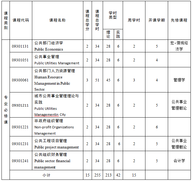 核心课程:管理学、社会学、经济学、公共管理学、公共部门经济学、公共政策、公共部门人力资源管理、公用事业管理、公共工程项目管理、公共组织财务管理等。
