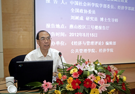 刘树成围绕“中国宏观经济波动的11个周期概述”、“中国经济高位—平稳运行的原因分析”、“转变经济发展方式刻不容缓”、“中国经济的崛起和复兴之路”四大方面的问题做了深入浅出的讲解,并对学校和学院发展寄予了厚望。