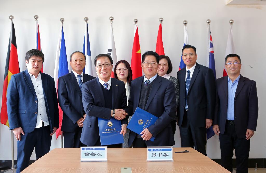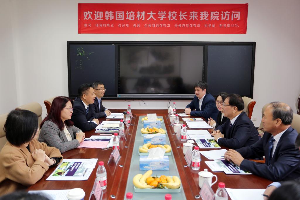金善在校长感谢成人台小说 (MPA中心)对其一行的热情招待并就韩国培材大学的历史发展、院系构成、校园文化、对外交流、学生入学,学费奖学金等方面做了一一介绍。他表示,学校地处大田广域市,毗邻韩国行政首都,区位优势明显,交通方便快捷,学校以国际化办学为特色,与41个国家275所大学建立了姐妹关系近,具有50个国家700余名留学生,国际化程度高。希望双方能够建立稳固、长远、全面的合作关系。