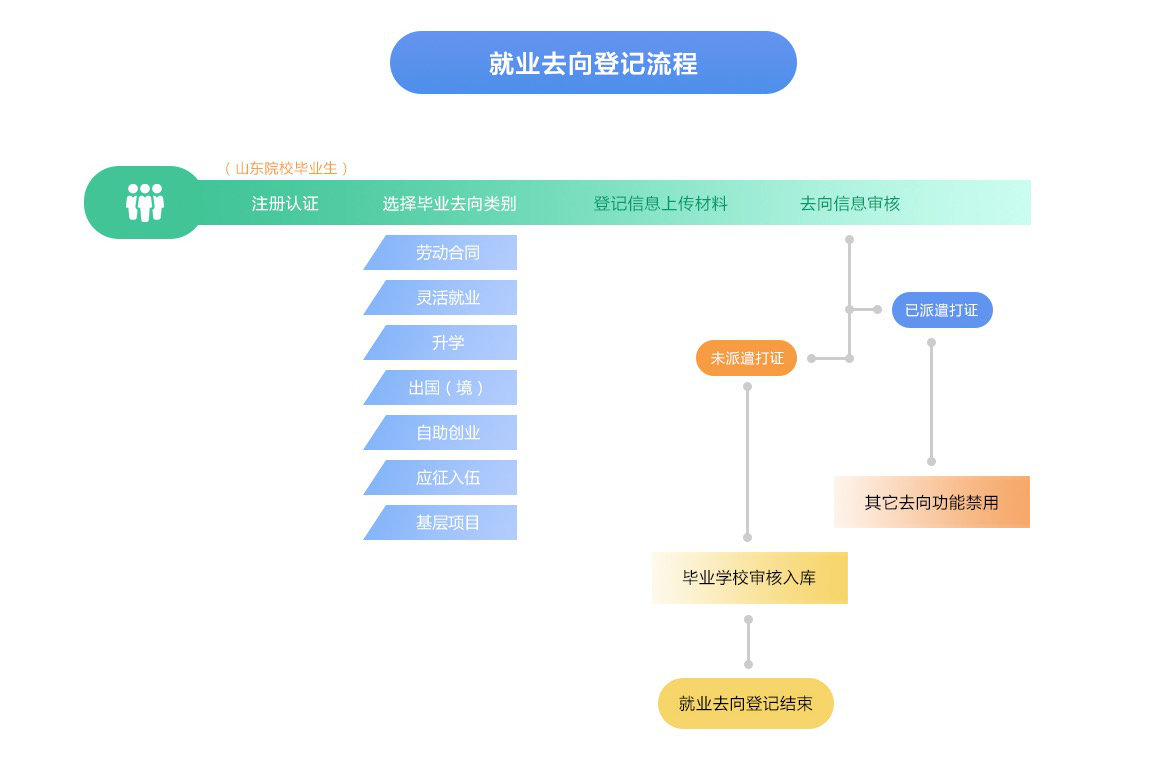 业务介绍:实现省内院校毕业生签订就业协议之外的毕业去向信息登记功能。包括劳动合同就业、其他录用形式就业、升学、出国(境)、自主创业(实体)、自主创业(电子)、应征义务兵、基层项目、自由职业、科研助理十种去向。