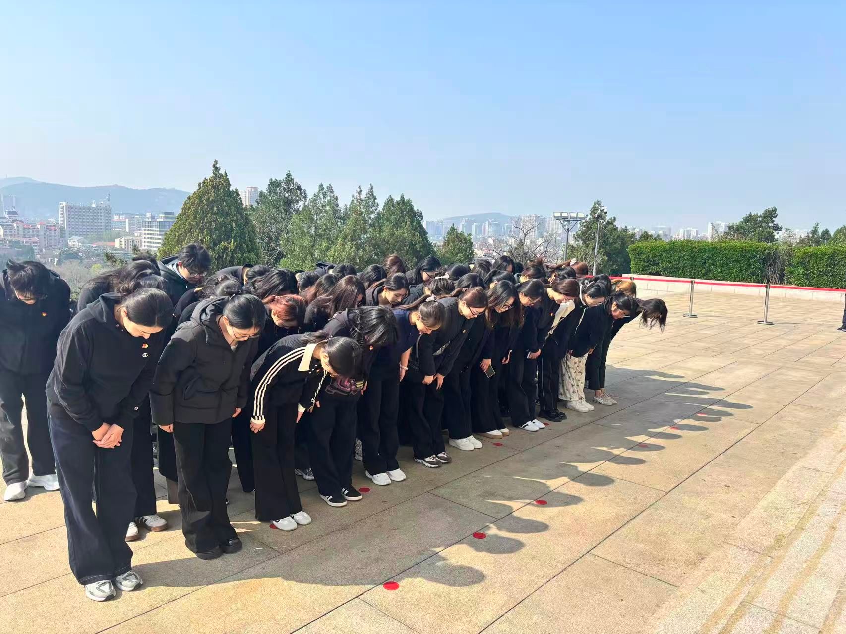 济南英雄山烈士陵园是缅怀革命先烈、传承红色精神的重要阵地,长眠着无数为民族解放、国家独立抛头颅、洒热血的革命志士。全体师生党员胸戴党员徽章,怀着无比崇敬的心情步入陵园,现场气氛肃穆庄重。