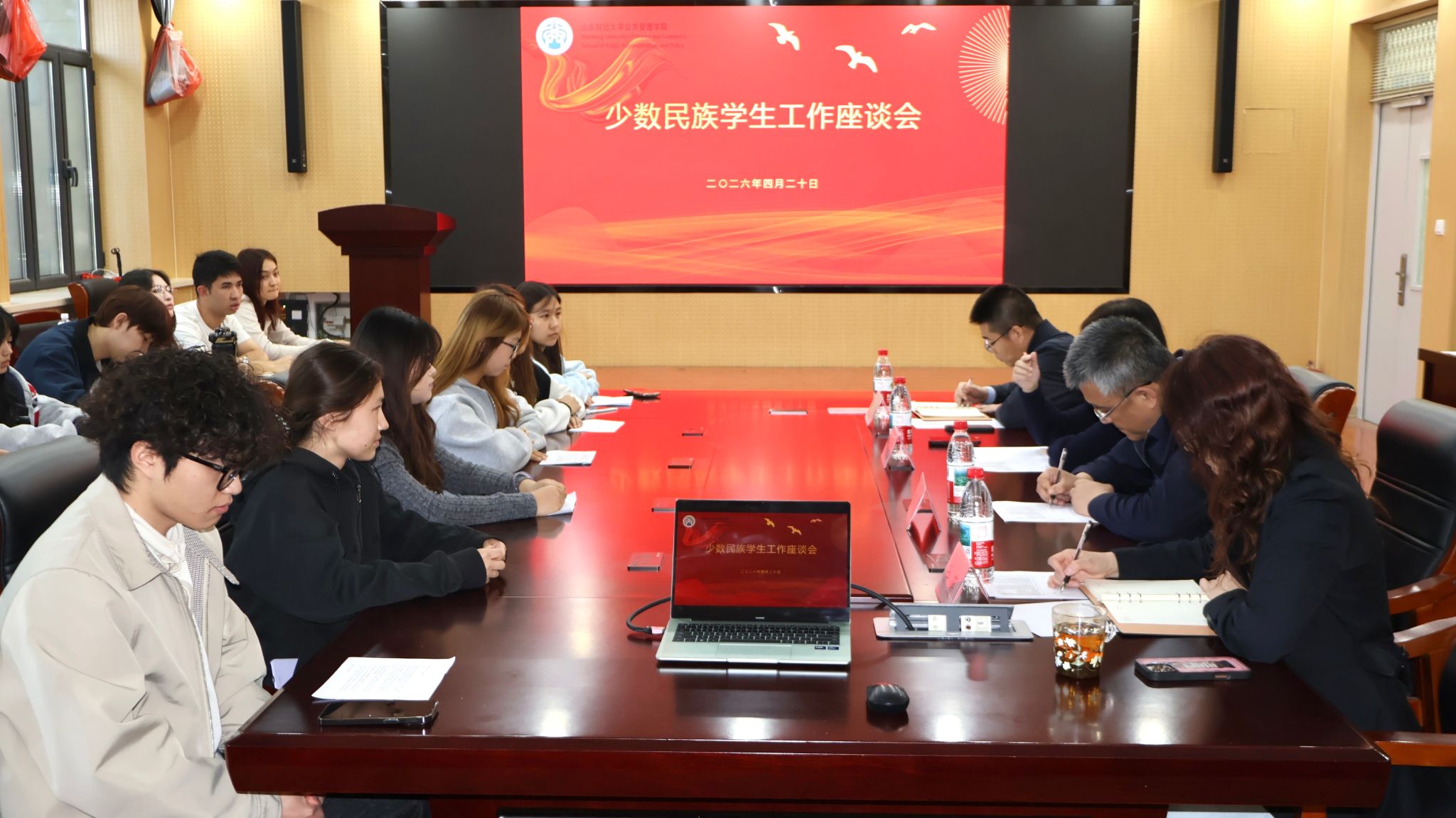 在章丘校区召开少数民族学生工作座谈会。学院党委书记田远、院长贾海彦、党委副书记许薇、副院长罗微,学院辅导员及 17 名少数民族学生代表参加。会议由许薇主持。