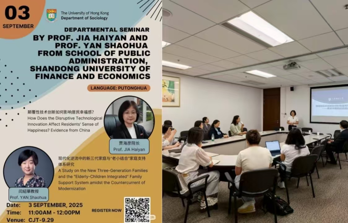 在香港大学,贾海彦、闫绍华分别面向港大师生作了题为《颠覆性技术创新如何影响居民幸福感》和《现代化逆流中的新三代家庭与“老小结合”家庭支持体系研究》的学术报告。报告聚焦经济社会转型中的居民福祉和家庭实践等前沿议题,凭借扎实的研究功底与跨学科视角引发在场学者热烈讨论。香港大学社会科学学院副院长、社会学讲座教授方伟晶对报告选题的前沿性、论证的严谨性给予高度评价。