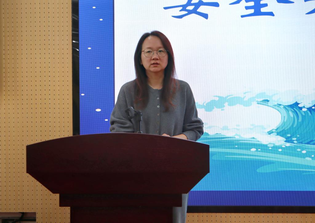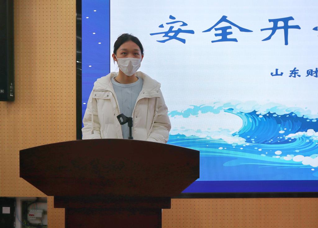 学生会主席李婷宣读安全开学“第一课”活动开展的各项细节。她清晰明了地讲述了安全开学“第一课”活动的开展形式和具体流程,通过宣读并签名倡议书、举办讲座活动、开展主题班会等丰富的活动形式,以班级为单位,开展安全教育活动,将安全观念传达给每一位同学,让学生了解和掌握更多的消防和预防诈骗常识,提高学生自救自护的应变能力和基本技能。